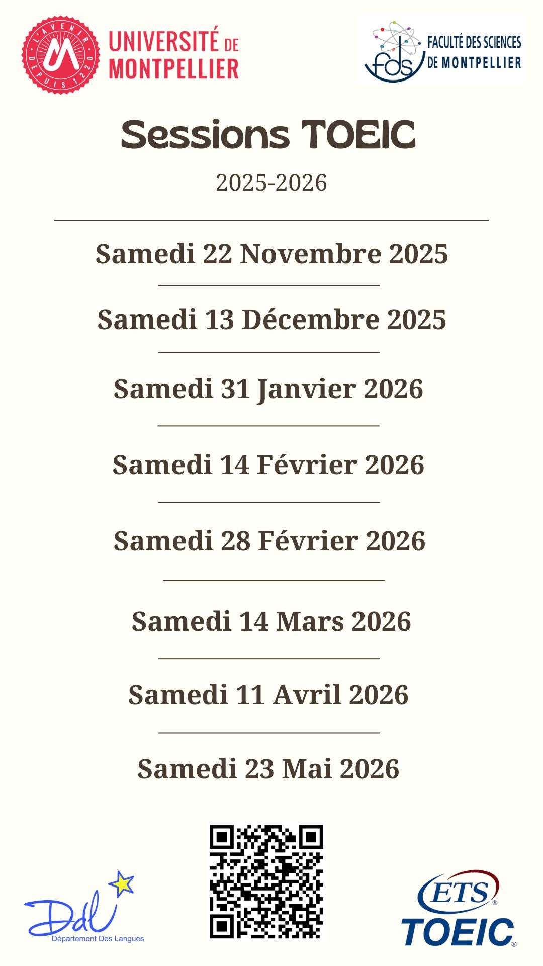 Les sessions TOEIC® Listening and Reading sont planifiées par le Département des Langues de la Faculté des Sciences.